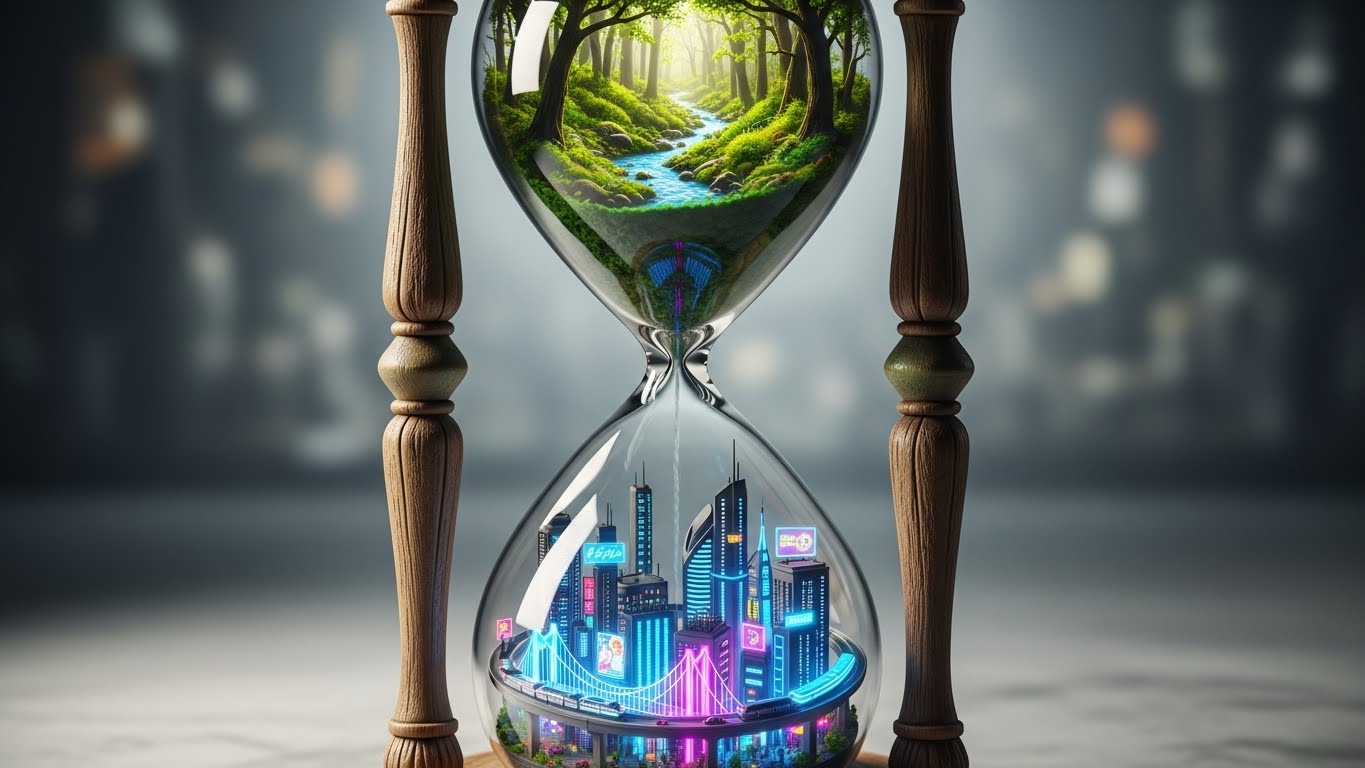 - Metáfora Visual (Antónimos): Prompt: "A realistic professional photography of a vintage hourglass where the top half is a vibrant, lush forest and the bottom half is a futuristic neon city. Sharp focus, artistic contrast."